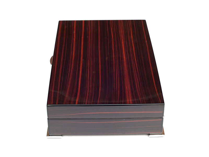 Dunkelbraun lackierte Exclusive Humidor aus spanischer Zeder für 30 Zigarren, mit verchromten Beinen, und mit einem verchromten Griff geöffnet, so diesen Humidor sehr elegant seht.